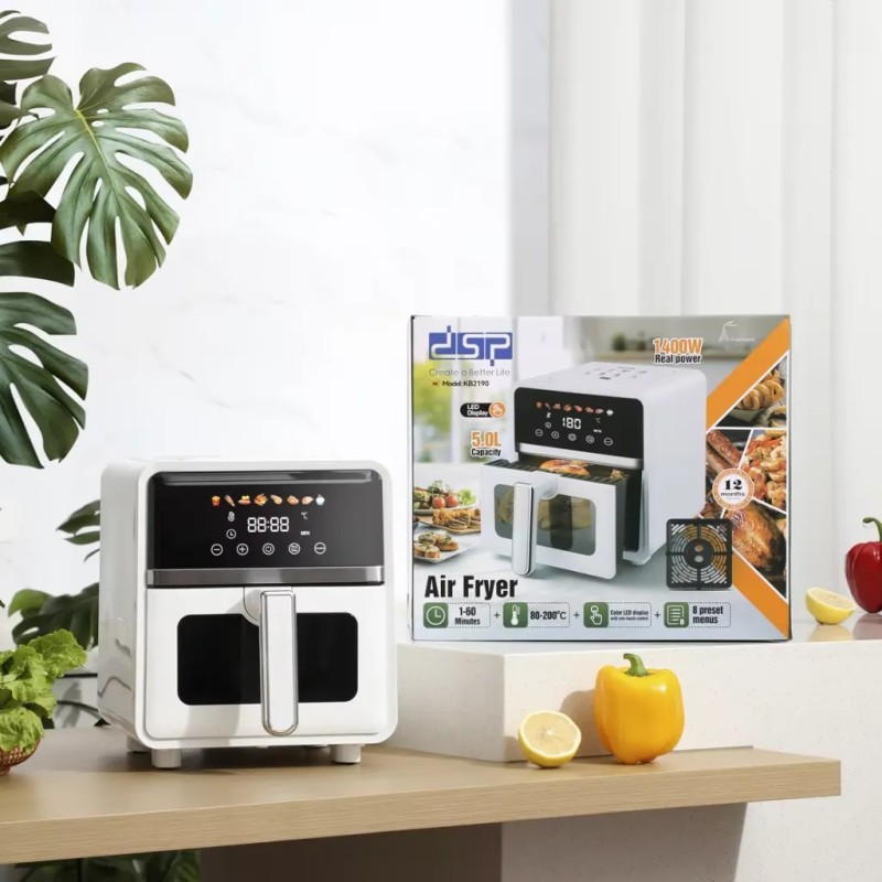 La friteuse à air DSP 5L est conçue pour offrir une cuisson moderne, rapide et plus saine. Grâce à sa puissance de 1400W et sa technologie de circulation d’air chaud, elle permet de cuire vos aliments de manière homogène avec peu ou sans huile.