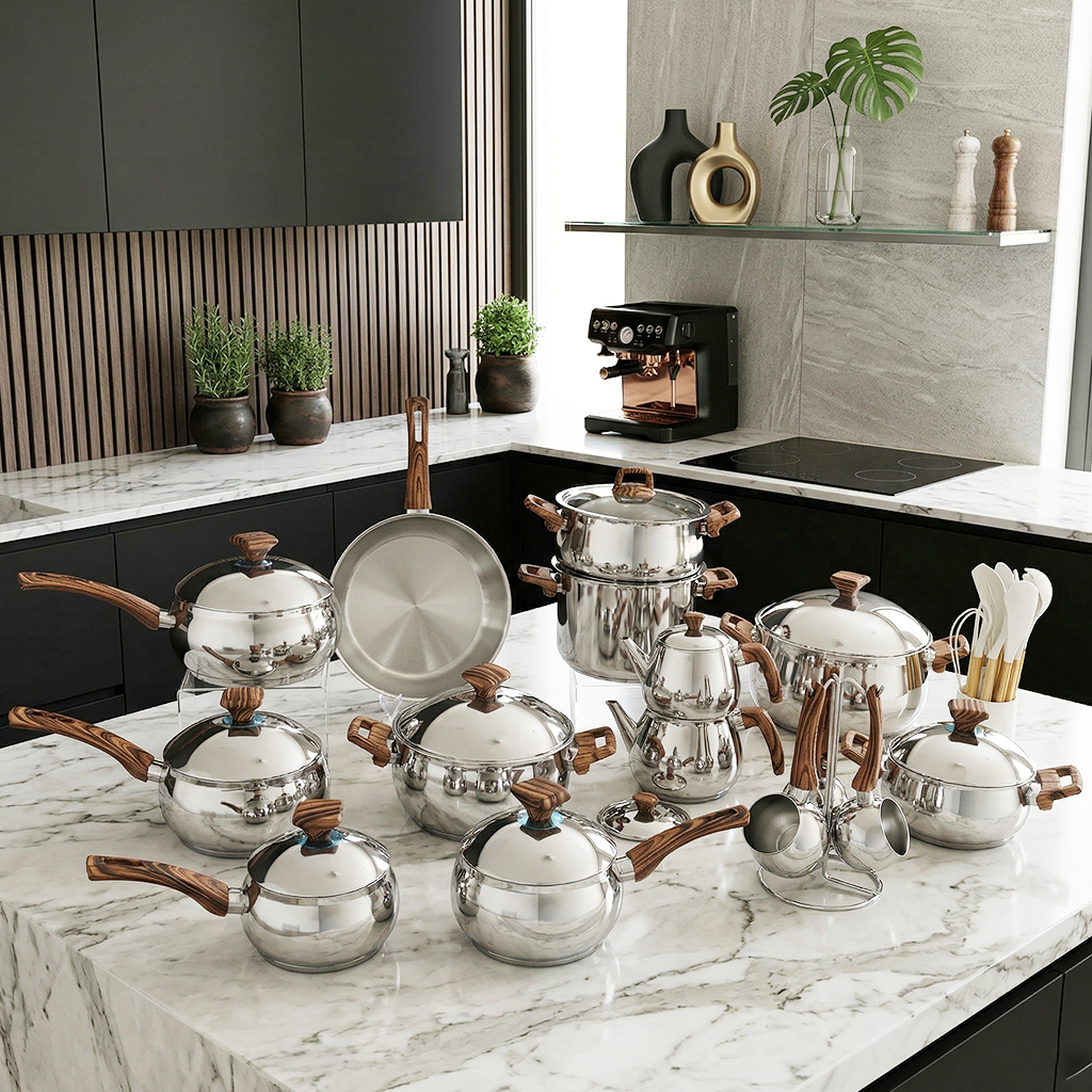 Découvrez l’excellence culinaire avec cette batterie de cuisine en acier inoxydable 18/10 de haute qualité, conçue pour une cuisson saine, rapide et efficace. Grâce à son fond à 3 couches, la chaleur est parfaitement répartie, garantissant une cuisson homogène et une économie d’énergie.