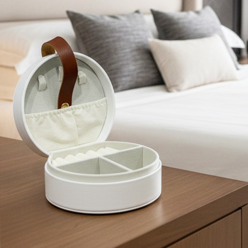 Élégant, compact et facile à transporter, ce coffret à bijoux rond est pensé pour garder vos accessoires préférés toujours bien rangés. Son format circulaire apporte une touche moderne et douce à votre coiffeuse tout en restant ultra-pratique pour un usage quotidien ou en voyage.