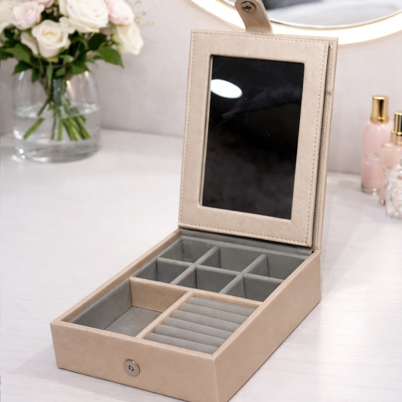 Ce coffret à bijoux au format vertical est pensé comme un véritable petit dressing pour vos bijoux. Son grand miroir intégré vous permet de choisir et d’associer facilement vos accessoires, tout en ajoutant une touche élégante à votre coiffeuse. Son intérieur est soigneusement structuré pour offrir une visibilité claire et un accès rapide à vos bagues, boucles d’oreilles, bracelets et colliers. Grâce à sa forme haute et compacte, il prend peu de place tout en offrant une capacité de rangement étonnante. Son revêtement beige doux et ses finitions soignées font de ce coffret un objet à la fois pratique et décoratif, idéal pour un usage quotidien ou comme cadeau raffiné.