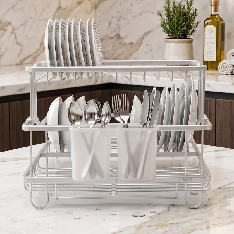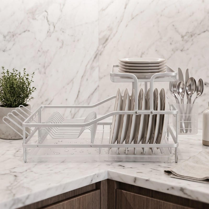 Idéal pour les cuisines compactes, cet égouttoir à vaisselle 2 niveaux en aluminium offre un rangement pratique tout en optimisant l’espace. Son design intelligent permet de séparer assiettes, bols et couverts pour un séchage efficace. Léger, résistant à la rouille et facile à entretenir, il s’intègre parfaitement dans toutes les cuisines avec un style moderne et épuré.