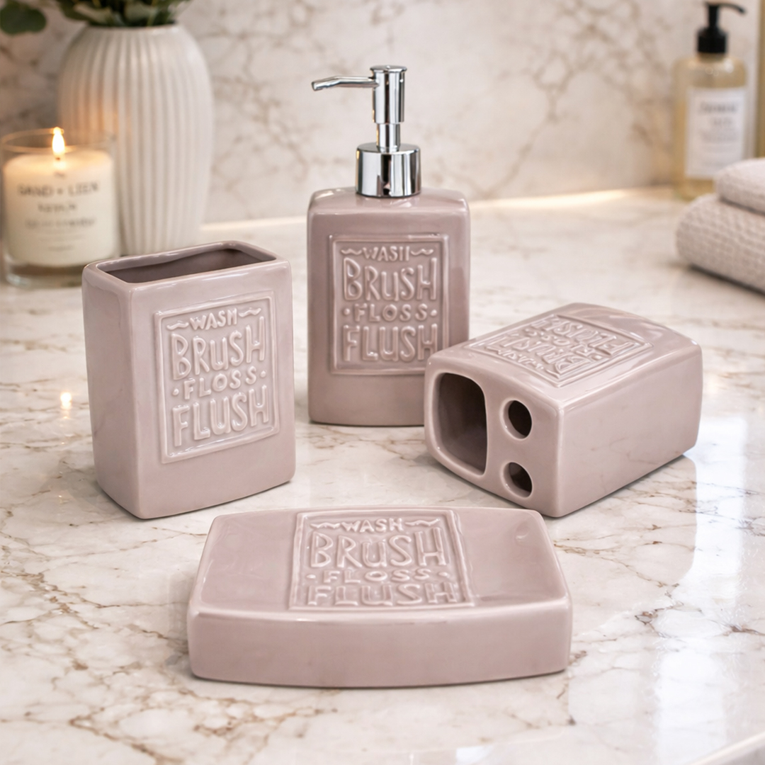 Composé d’un distributeur de savon, de deux supports (brosses à dents ou accessoires) et d’un porte-savon, ce set est idéal pour une salle de bain propre, bien rangée et harmonieuse.