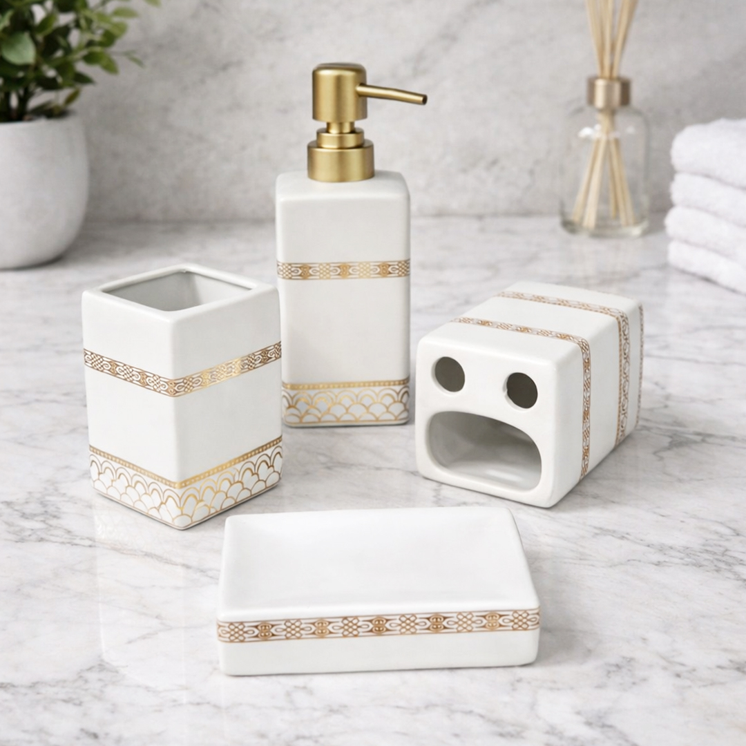 Composé d’un distributeur de savon, de deux supports (brosses à dents ou accessoires) et d’un porte-savon, ce set est idéal pour une salle de bain propre, bien rangée et harmonieuse.