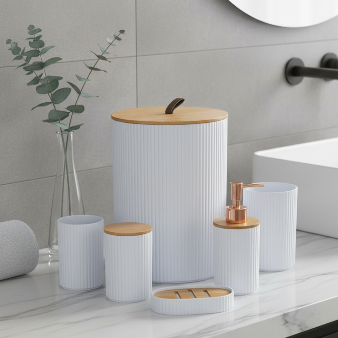 Ensemble Salle de Bain 7 Pièces en Plastique Blanc & Bois