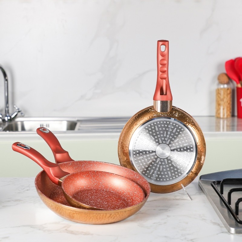 Grâce à leur revêtement intérieur antiadhésif effet pierre, ces poêles garantissent une cuisson saine, homogène et sans accroche, même avec peu ou pas de matière grasse. Leur fond diffuseur épais assure une excellente répartition de la chaleur, pour des cuissons rapides et uniformes. Parfaites pour saisir, dorer ou mijoter vos aliments, elles sont compatibles avec tous types de feux, y compris l’induction.
