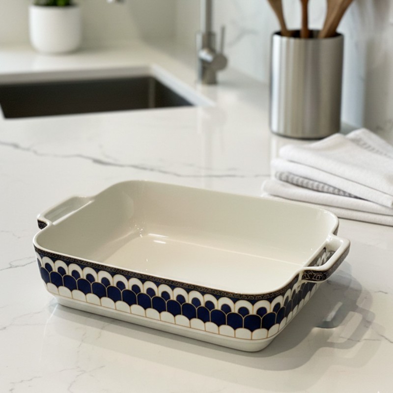 Ce plat à four rectangulaire en céramique allie élégance et performance pour sublimer vos repas du quotidien comme vos présentations de table. Son design bleu et doré apporte une touche raffinée et moderne, idéale pour servir directement du four à la table. Résistant à la chaleur et conçu pour une cuisson homogène, il est parfait pour gratins, lasagnes, rôtis, desserts et plats familiaux.