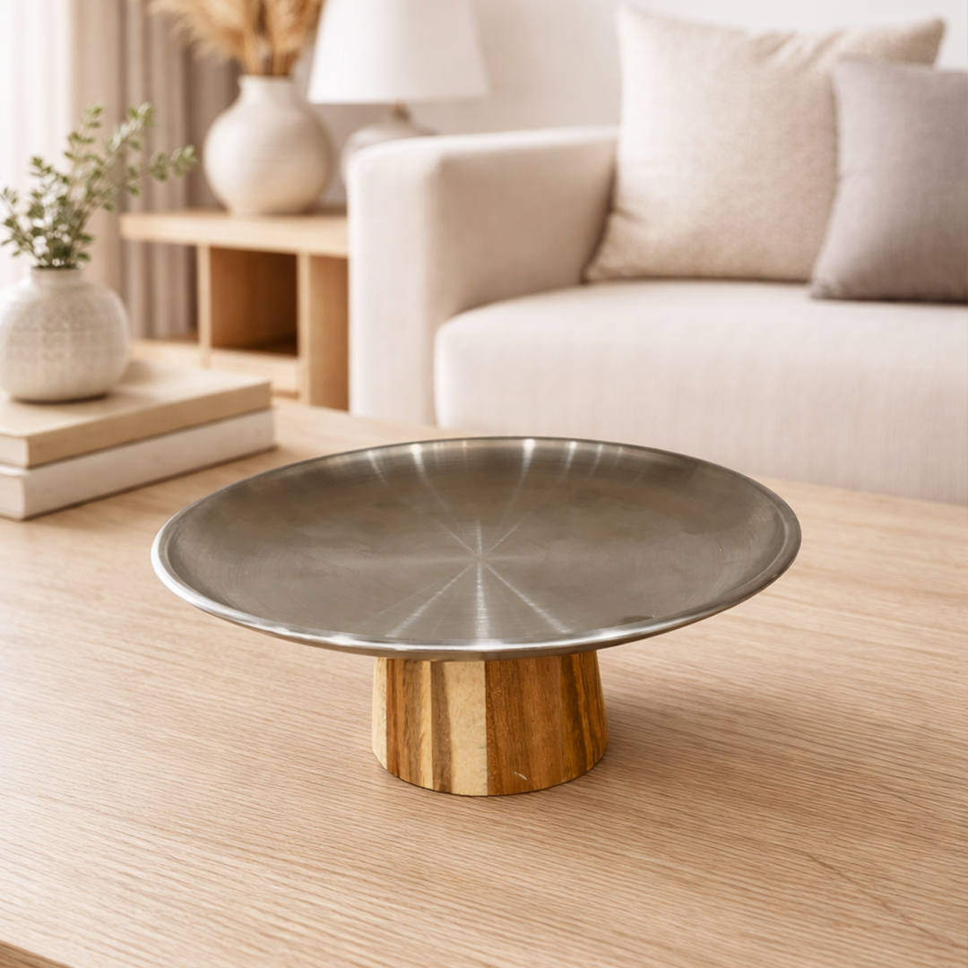 Présentez vos gâteaux et pâtisseries avec élégance grâce à ce plateau à gâteau sur pied en acier inoxydable avec base en bois. Son design moderne et minimaliste apporte une touche raffinée à votre table.