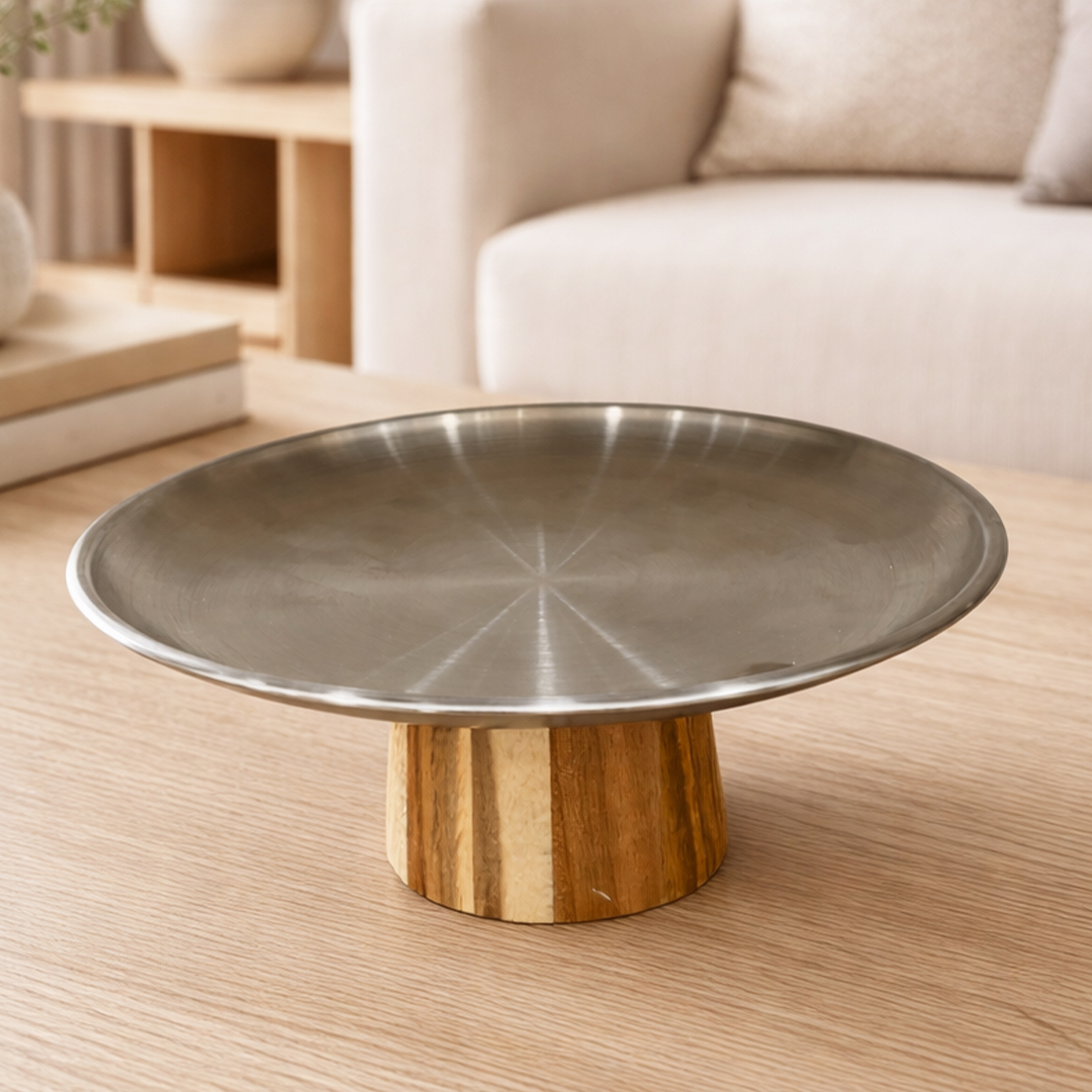 Présentez vos gâteaux et pâtisseries avec élégance grâce à ce plateau à gâteau sur pied en acier inoxydable avec base en bois. Son design moderne et minimaliste apporte une touche raffinée à votre table.
