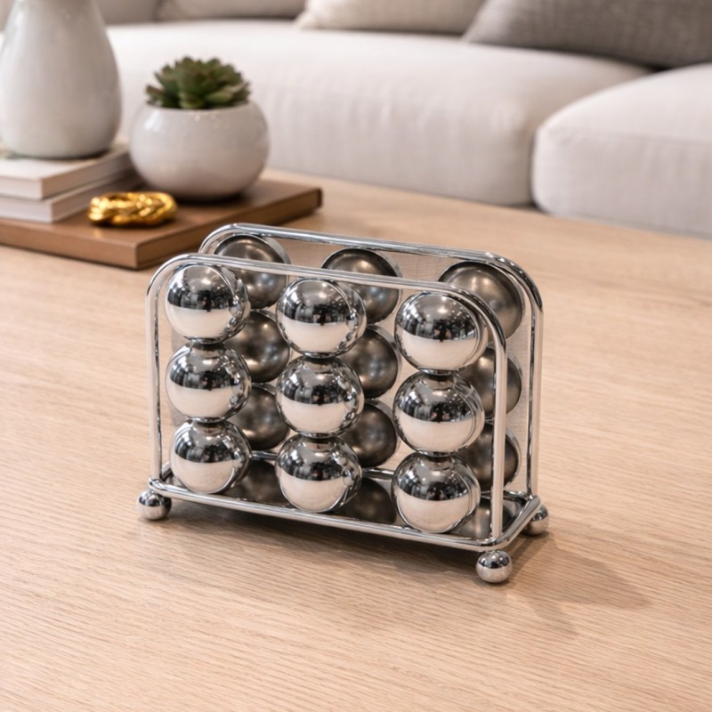Apportez une touche d’élégance moderne à votre table avec ce porte-serviettes au design raffiné. Sa structure en métal argenté, ornée de billes décoratives brillantes et d’un fond effet miroir, reflète la lumière et sublime votre décoration. Idéal pour une table de réception, un buffet ou un coin café, il maintient vos serviettes bien en place tout en ajoutant une note chic et sophistiquée.