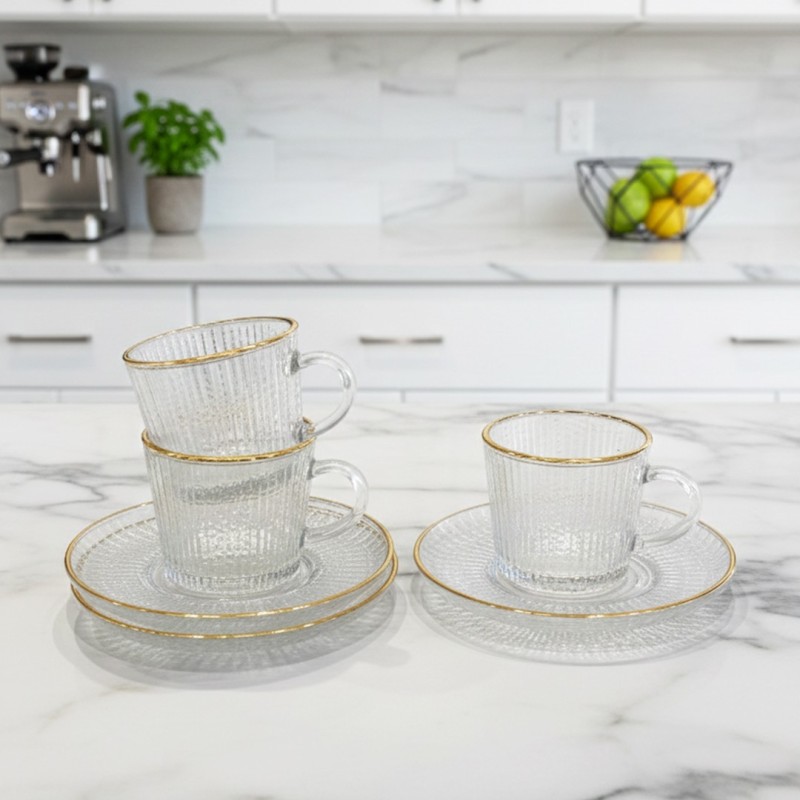 Apportez une touche raffinée à vos moments café avec ce service à café en verre , composé de tasses élégantes et leurs soucoupes assorties. Son verre travaillé avec relief décoratif et sa finition dorée délicate offrent une présentation chic et moderne. Parfait pour servir espresso, café turc ou café serré, ce service met en valeur votre table tout en restant pratique pour un usage quotidien. Sa transparence élégante permet de sublimer la couleur de votre café et d’impressionner vos invités.