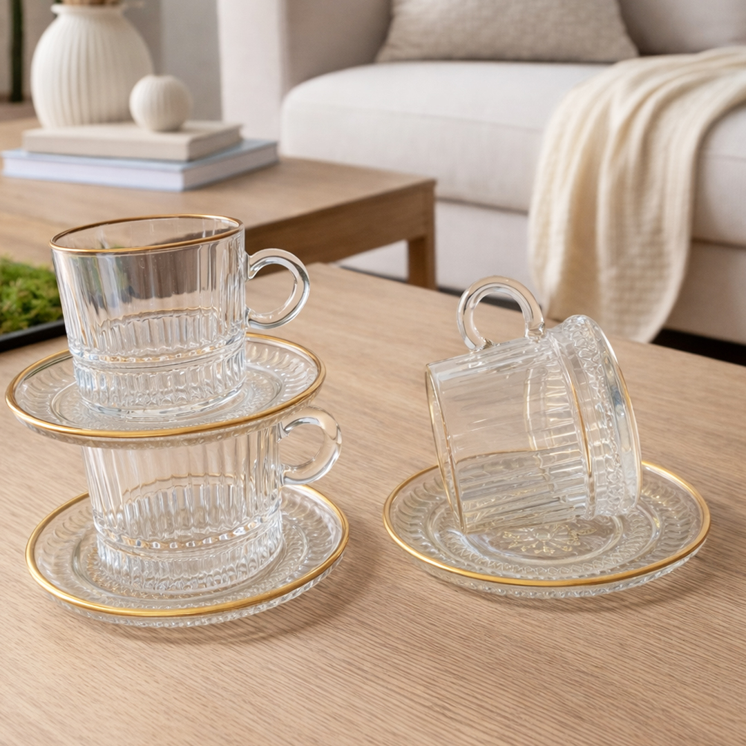 Apportez une touche d’élégance à vos moments café avec ce service à café en verre transparent au design raffiné. Son verre décoré avec des détails élégants et sa bordure dorée donnent une allure chic et moderne à votre table.