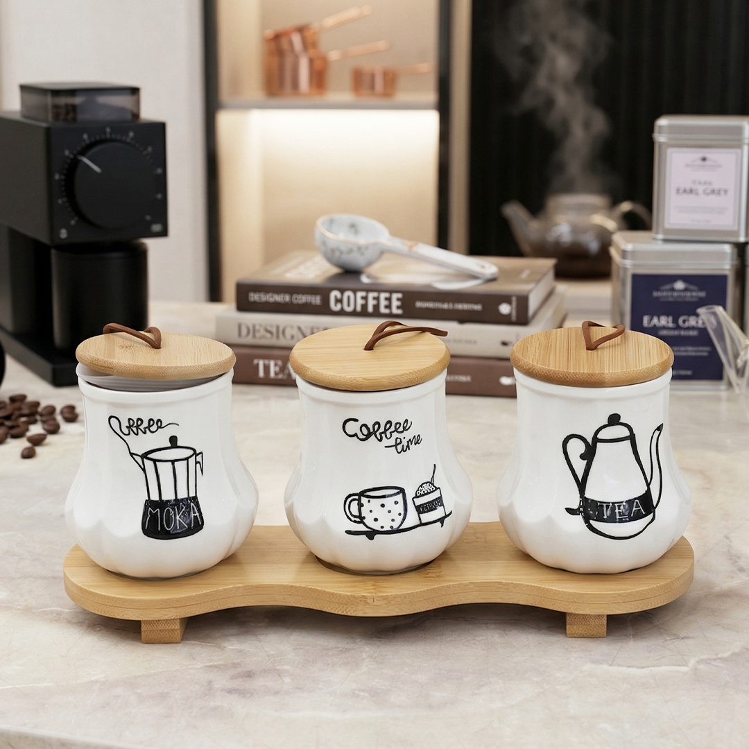 Apportez une touche d’élégance et d’organisation à votre cuisine avec ce set de pots en céramique avec support en métal et base en bois. Conçu pour allier praticité et esthétique, il permet de ranger facilement vos essentiels du quotidien comme le sucre, le thé, le café, les épices ou la farine.