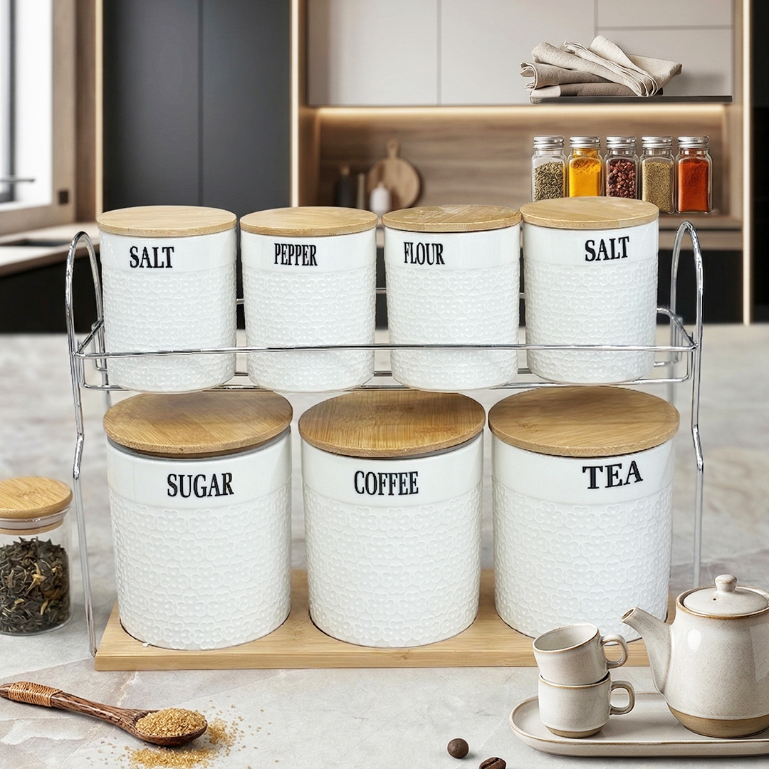 Grâce à ses bocaux en céramique de haute qualité avec couvercles hermétiques en bois, vos ingrédients restent frais plus longtemps et protégés de l’humidité. Le support métallique à deux niveaux offre un rangement optimisé tout en gardant un accès rapide à chaque pot.