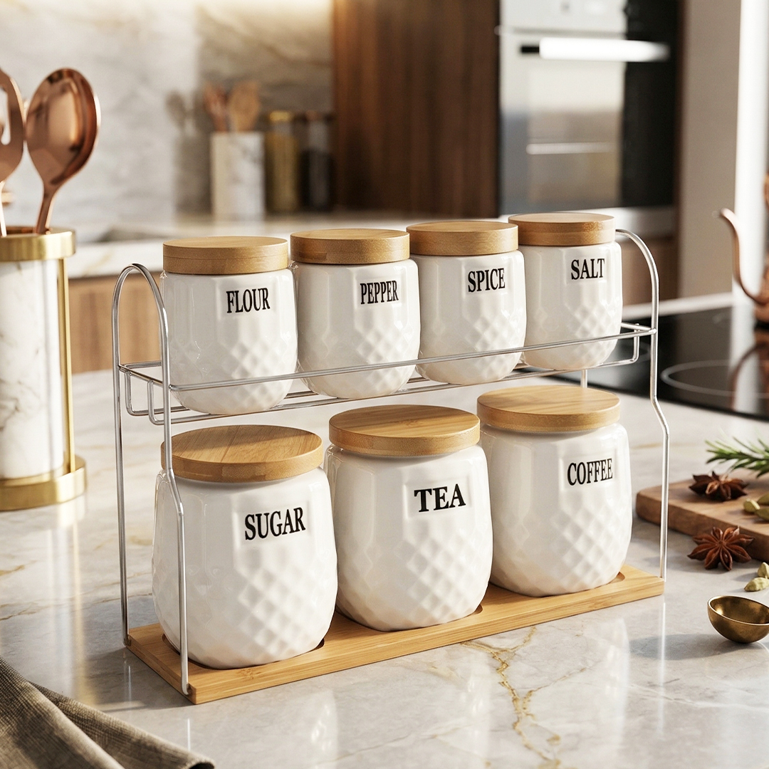 Grâce à ses bocaux en céramique de haute qualité avec couvercles hermétiques en bois, vos ingrédients restent frais plus longtemps et protégés de l’humidité. Le support métallique à deux niveaux offre un rangement optimisé tout en gardant un accès rapide à chaque pot.