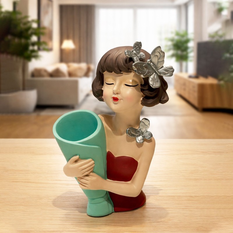 Cette statue décorative femme avec vase est une pièce artistique au style doux et raffiné, idéale pour apporter une touche poétique et élégante à votre intérieur. La figurine représente une femme délicate tenant un vase intégré, parfait pour accueillir des fleurs, des tiges décoratives ou simplement être utilisé comme objet décoratif. Son design moderne, ses détails dorés en forme de papillons et ses couleurs harmonieuses en font un véritable objet de décoration pour le salon, la chambre ou un bureau. Fabriquée en résine de haute qualité, elle garantit solidité, stabilité et finitions soignées.